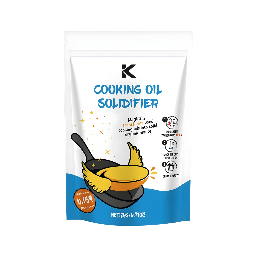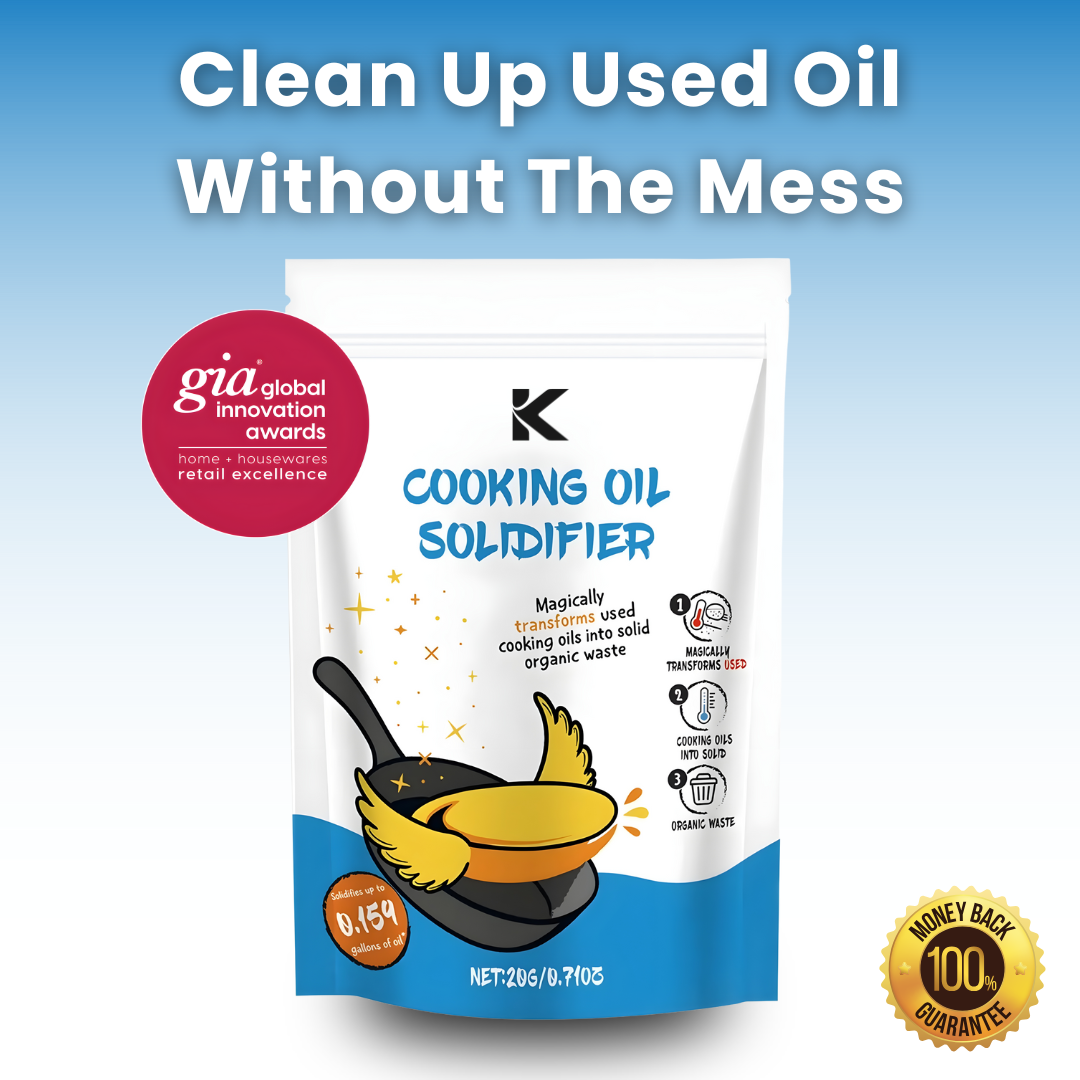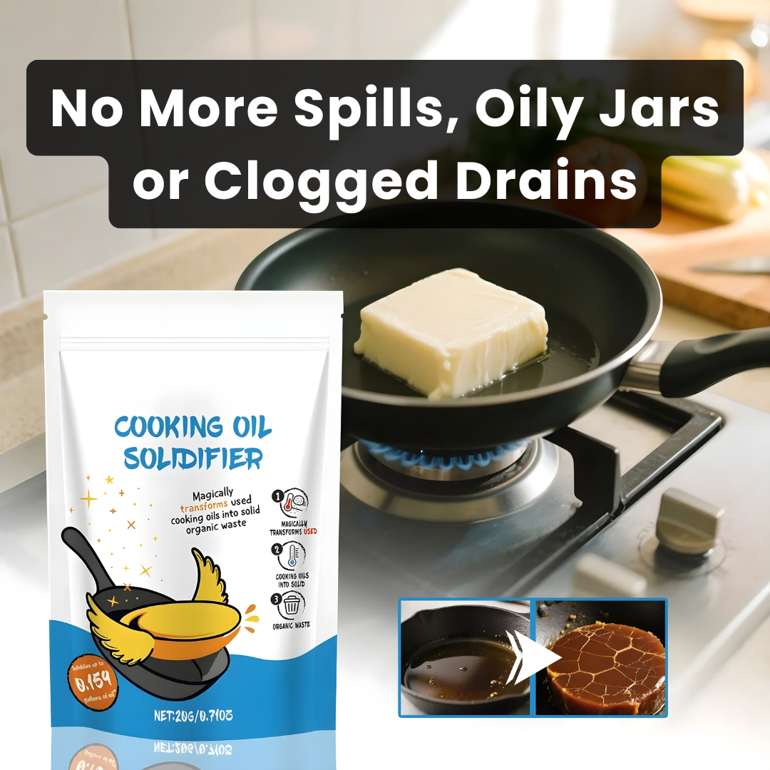 A quick-clean powder that instantly solidifies hot cooking oil so you can toss it straight in the trash: no waiting, no jars, no mess.