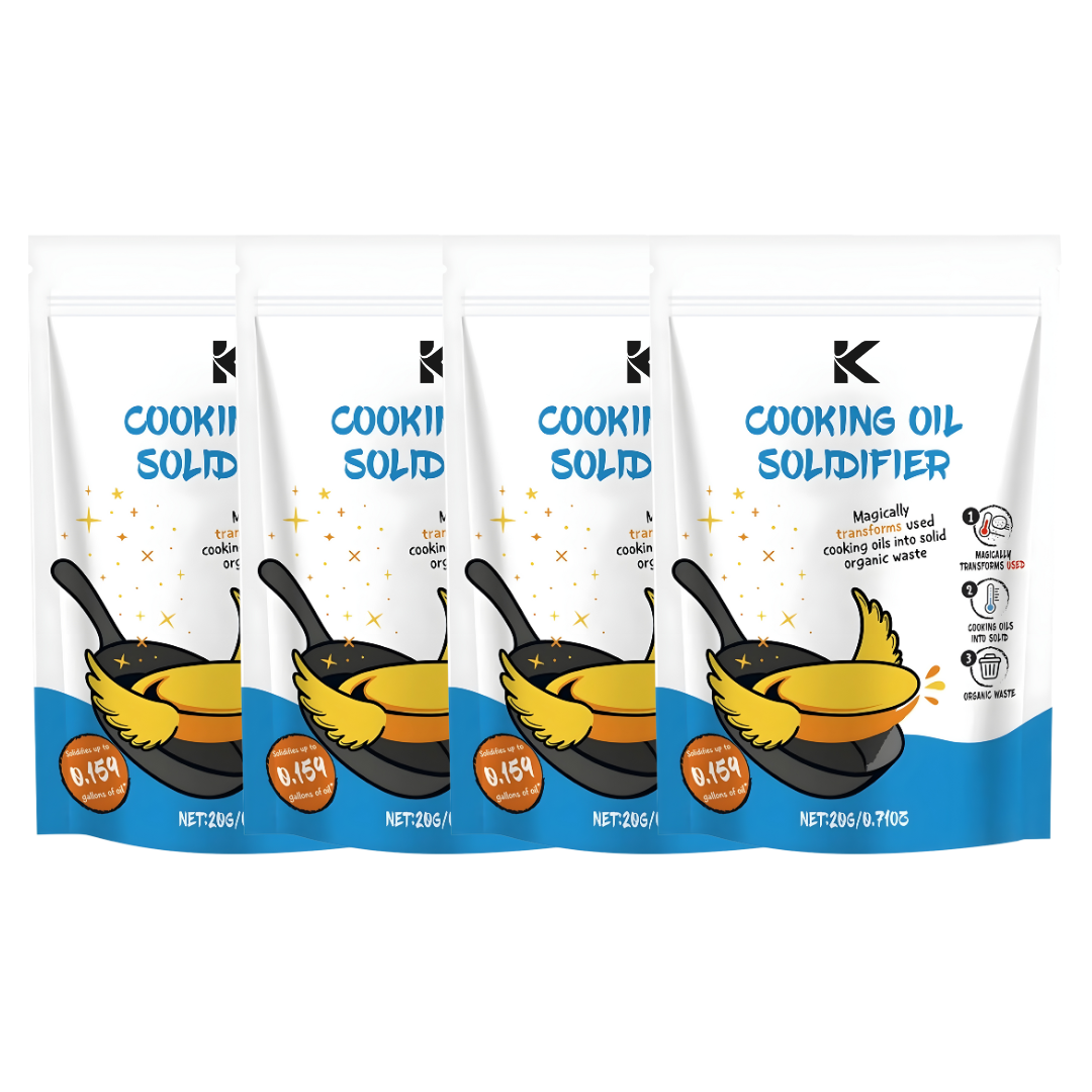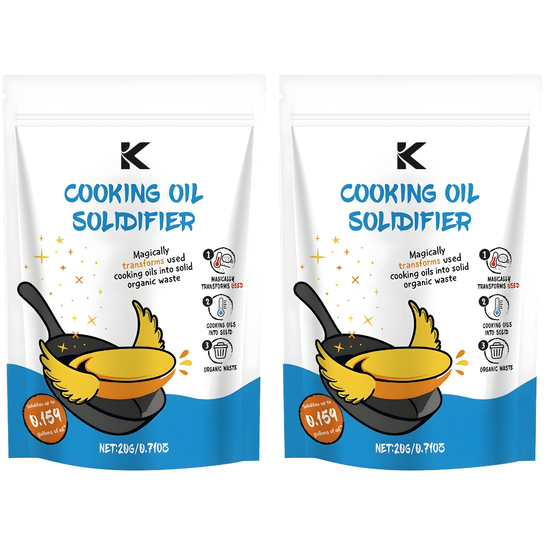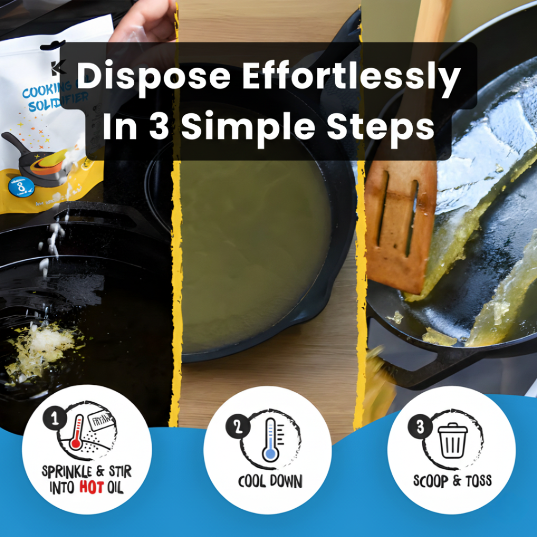 A quick-clean powder that instantly solidifies hot cooking oil so you can toss it straight in the trash: no waiting, no jars, no mess.